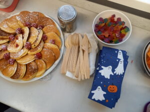 Die Klasse 5a feierte ihr erstes Halloween-Fest am Diesterweg-Gymnasium! Im Club Français standen spannende französische Vokabeln auf dem Programm: un zombie, un vampire, une citrouille, un chat noir und une sorcière. Die Schüler:innen notierten sich die neuen Wörter, fertigten dazu kreative Zeichnungen an und dekorierten den Klassenraum damit. Begleitet wurde das Ganze von einer gruseligen Sprachanimation. Es wurde getanzt, gesungen, gespielt und natürlich auch gegessen. Außerdem gab es ein Buffet mit selbstgemachten Snacks und Leckereien der Kinder. So entstand eine stimmungsvolle Halloween-Atmosphäre!