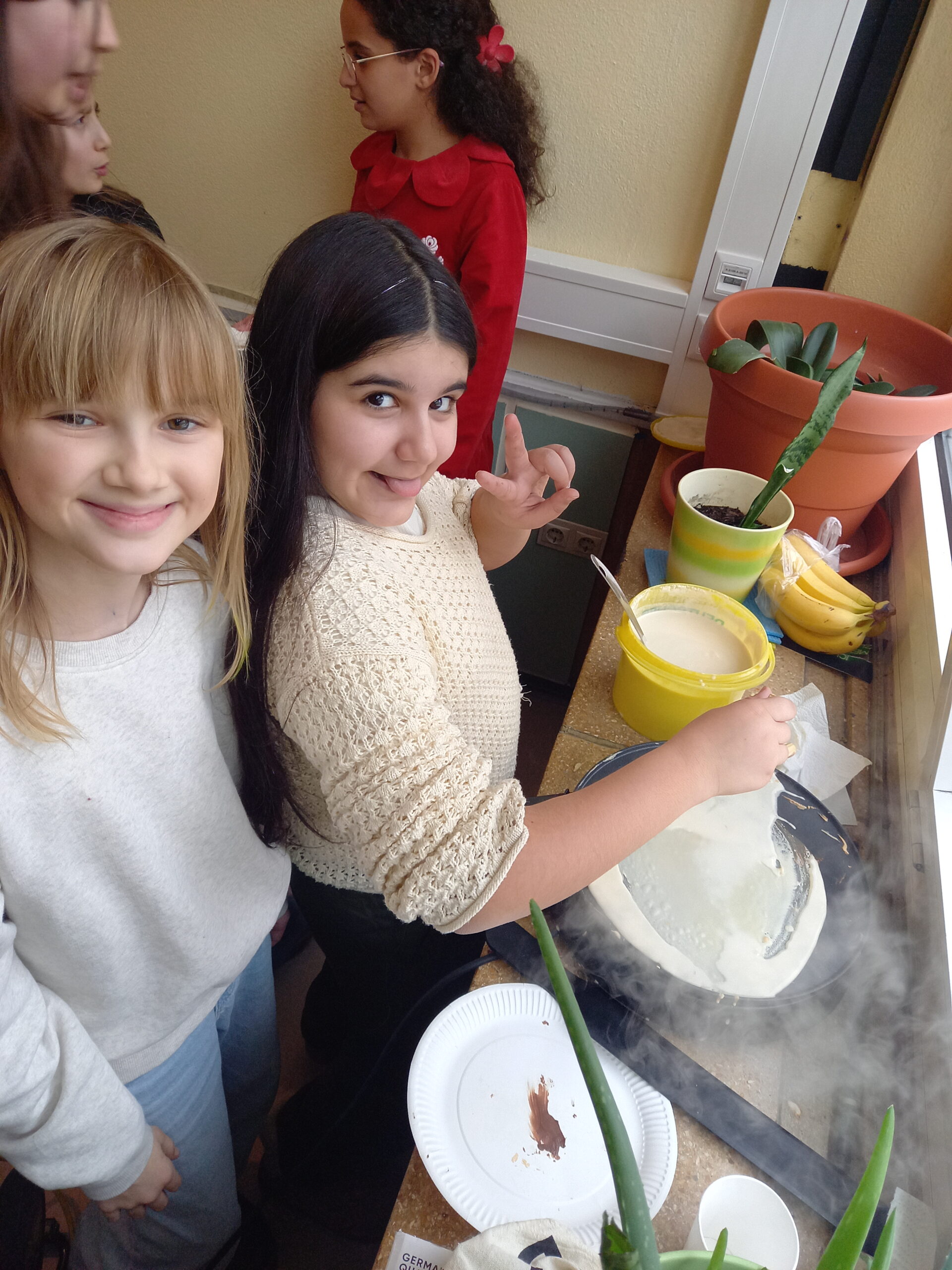 Das Rezept wurde im Unterricht übersetzt, der Crêpeteig von den Kindern zubereitet, die Crêpe-Maker aufgebaut und der Tisch gedeckt. Anschließend durften die Kinder ihre eigenen Crêpes backen und mit unterschiedlichen Zutaten wie Zimt, Zucker, Apfelmus, Nutella und Bananen genießen.